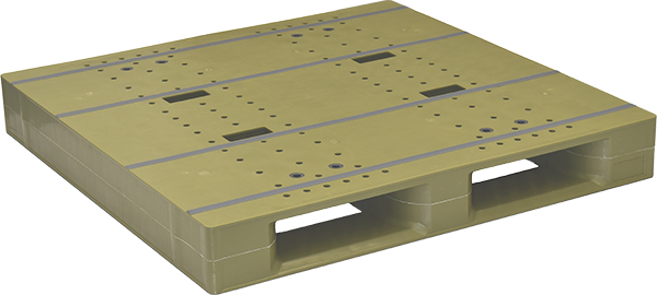 国内標準1100×1100×144Hサイズで、保管から流通まで一貫して使用できます。自動倉庫に対応する高強度&ガスアシスト成形による軽量化を実現。