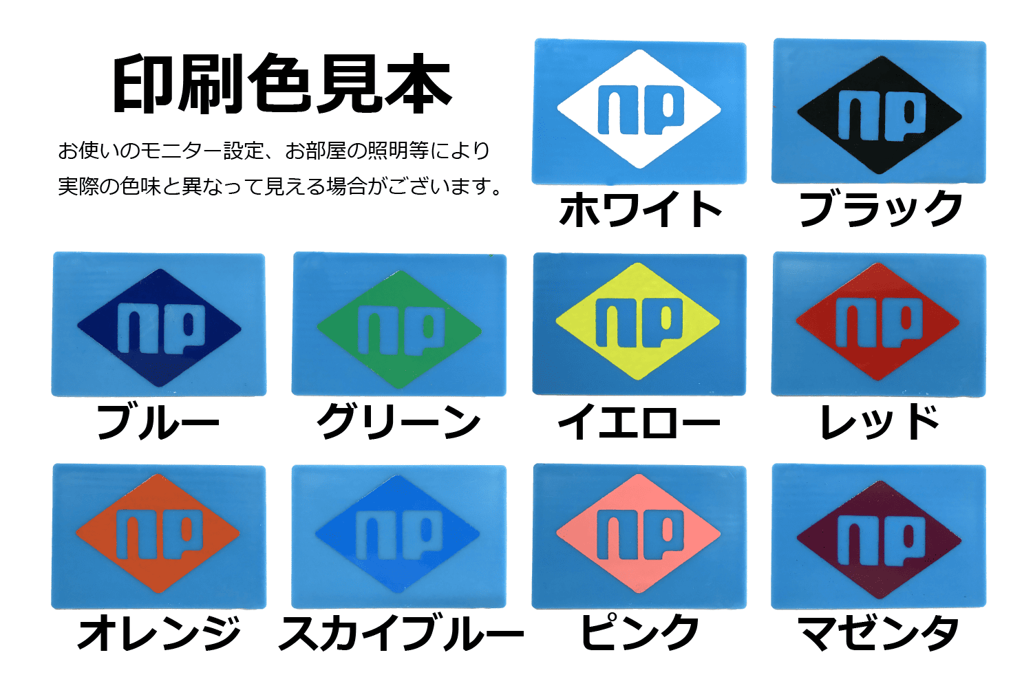 ブラック・ホワイト・ブルー・グリーン・イエロー・レッド・オレンジ・スカイブルー・ピンク・マゼンタの10色からお選びいただけます。その他特注色についてはご相談ください。