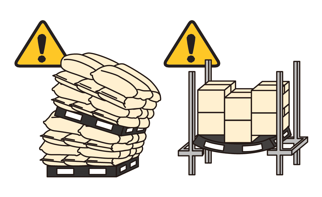 載せる物の重さ、形状、またはラックの仕様によってはパレットの変形や破損により荷崩れが生じる場合がございます。下記事項をご確認いただき、使用可否に関する詳細はお問い合わせください。