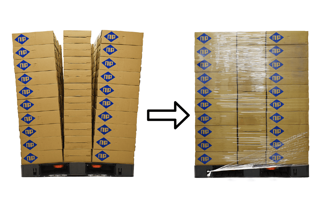 曲げ強度が弱いパレットを使用する際は、リフトアップ時に「荷割れ」が起こり、そのままでは搬送できない場合があります。以下のような対策(荷崩れ防止措置)を行うことで搬送できるようになります。