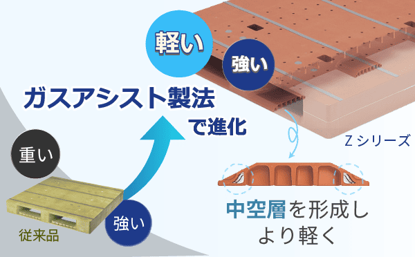 当社独自のガスアシスト製法で、パレット内部を中空化。必要強度は保ったまま、軽量化した”リデュース(省資源)パレット”です。