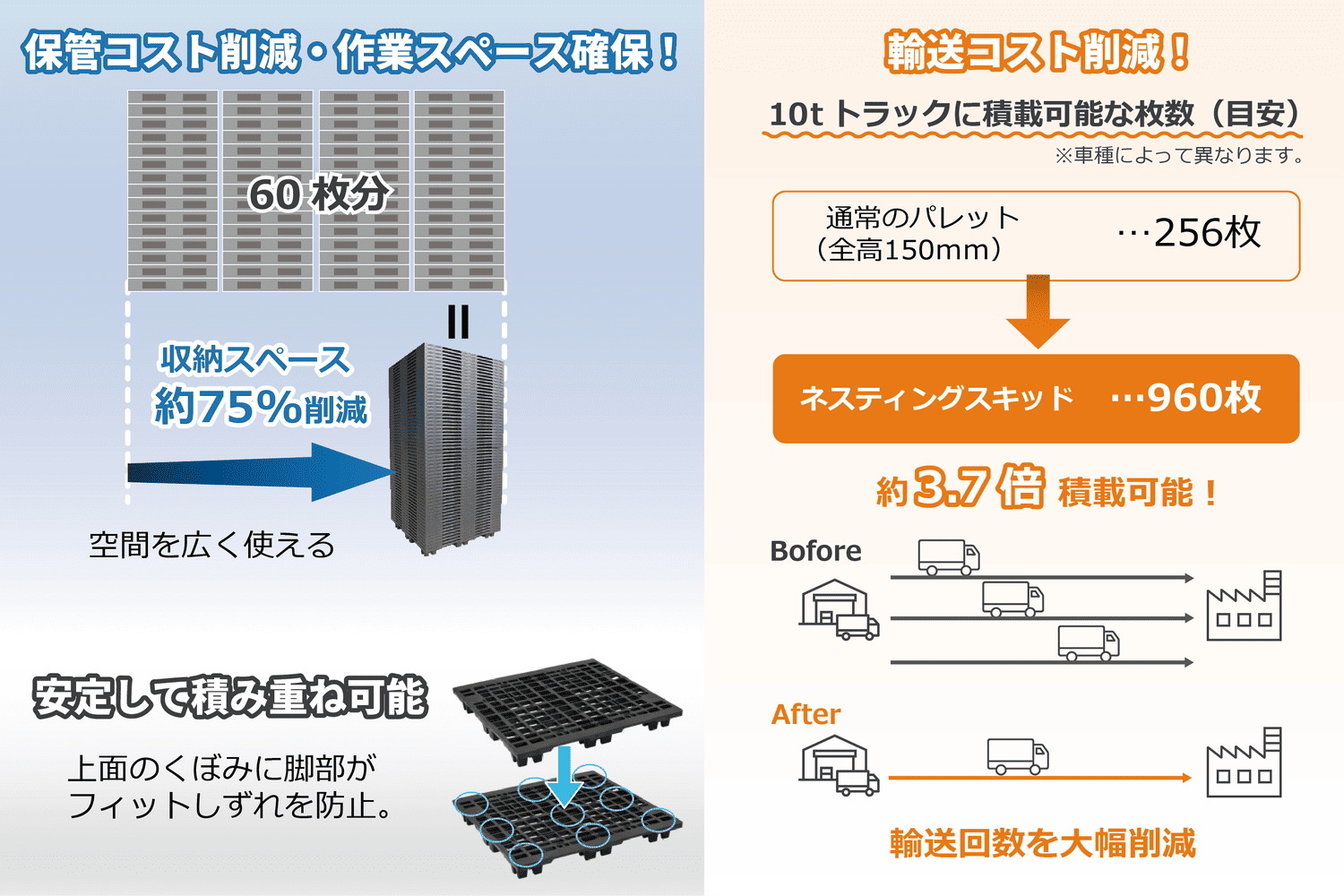 冷凍・冷蔵環境下での耐衝撃性が優れています。高所からの落下やフォーク爪追突時のパレット破損がPPよりも抑えられます。