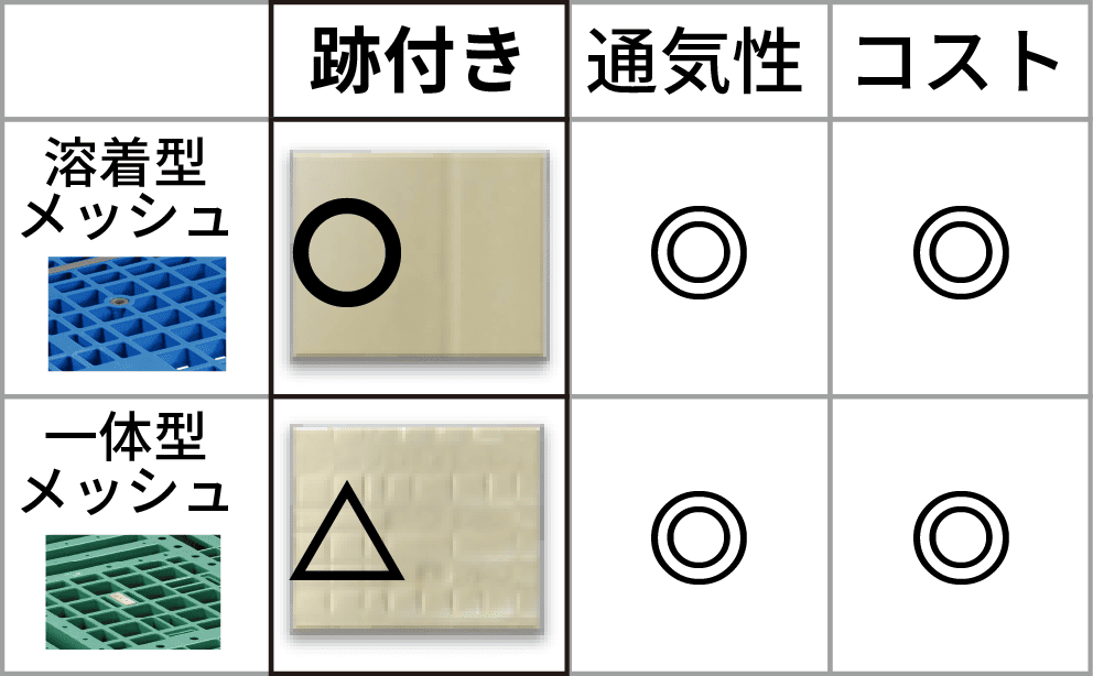 加熱溶融した樹脂を金型内へ射出注入し、冷却・固化させます。1ショットの射出で、パレットが作られるので、比較的低コストな成形方法です。金型の構造上、積載面はメッシュ形状のものが大半で、曲げ強度は溶着タイプより劣ります。